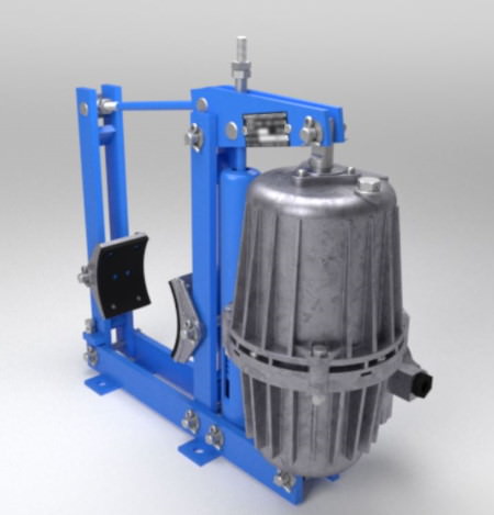 В устройство колодочного Тормоза ТКГ-300 входят следующие составляющие: электрогидравлический толкатель, тяги, колодки, пружина, рычажная система, основание, фиксаторы колодок, а также регулировочные винты.